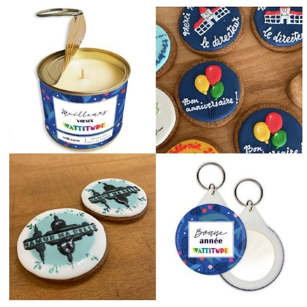 Pour aller plus loin dans la personnalisation de vos cadeaux d'entreprise, nous travaillons en collaboration avec Artlequin et la Biscuiterie Namuroise qui proposent respectivement des bougies et porte-clés, et des biscuits à customiser aux couleurs de votre entreprise !