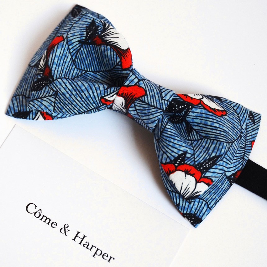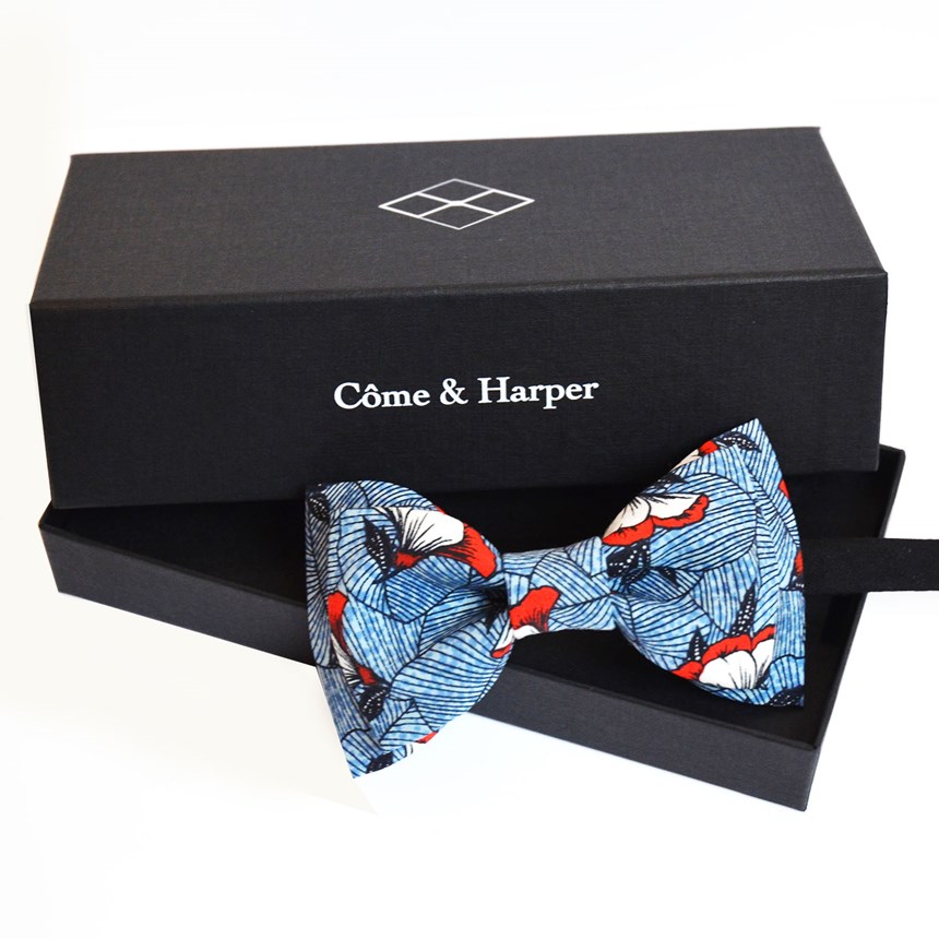 nos ateliers de Tournai. Le tissu, 100 % coton, a été choisi avec patience et passion. Le noeud s’attache avec un tour de cou en tissu noir ajustable à l’aide de petits crochets cachés discrètement derrière le corps du noeud papillon.Après usage, replacez-